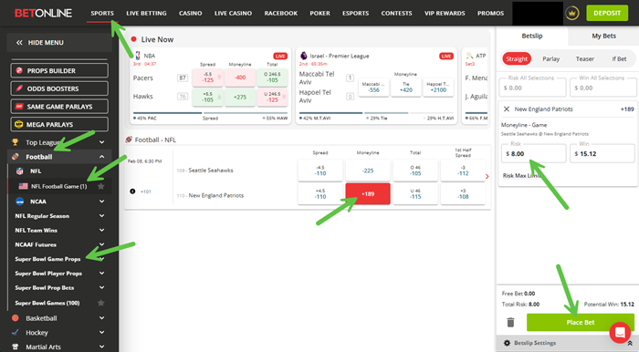 Here’s a screenshot showing you some of the clicks to make. In this example, I’m making a bet on the Patriots to win the game (+189).