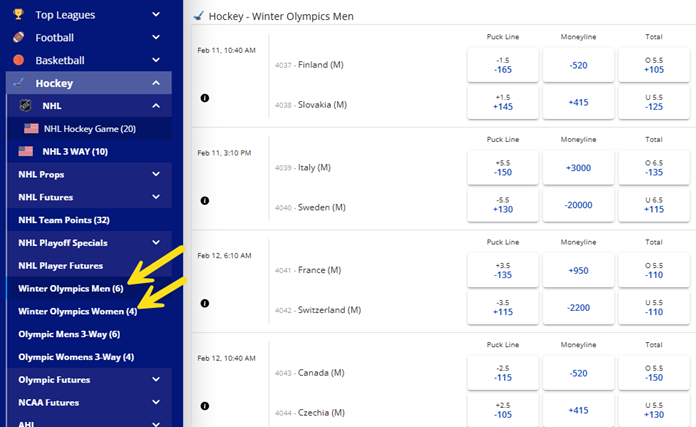- Open the ‘Winter Olympics 2026’ menu in the Sportsbook to find the different Olympic sport betting markets. SportsBetting has organized the betting lines alphabetically by event name.